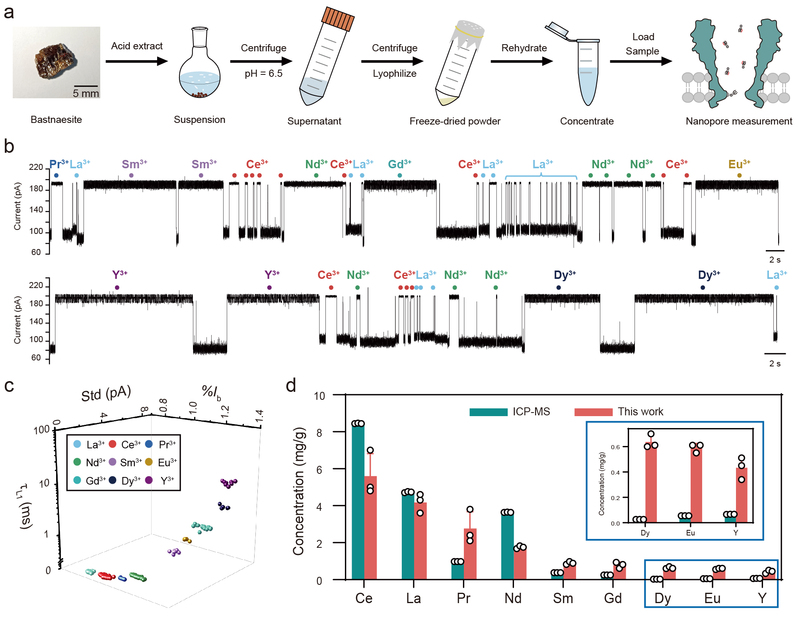 隨后該團隊將雙配體策略應(yīng)用到真實稀土礦石—氟碳鈰礦的分析中(圖3),通過酸解凍干提取氟碳鈰礦中的稀土,并利用納米孔進行鑒定和定量分析,成功鑒定出氟碳鈰礦中的稀土種類和豐度,且納米孔檢測結(jié)果與ICP-MS結(jié)果相一致。這一結(jié)果體現(xiàn)了該方法的實用性,展示其在礦石勘探領(lǐng)域的應(yīng)用潛力。