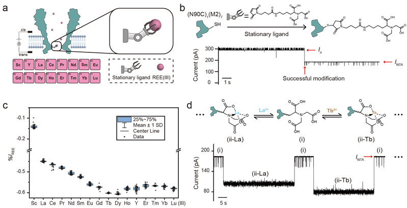 為了進一步提高對稀土的區(qū)分能力,該團隊在單配體策略的基礎(chǔ)上引入第二個游離的配體,創(chuàng)新性地提出雙配體策略(圖2)。當孔道上的固定配體(NTA)螯合三價稀土離子時,此時稀土離子還有多余的空軌道可以與游離配體(N,N-雙 (羧甲基)-L-賴氨酸,ANTA)發(fā)生配位作用,從而匯報出專屬于該稀土離子的特異性事件,機器學習識別準確率高達99.6%,這是世界上第一個能完全分辨所有稀土的納米孔。同時,該團隊也通過稀土離子的特異性事件在單分子水平上觀測到鑭系收縮規(guī)律。